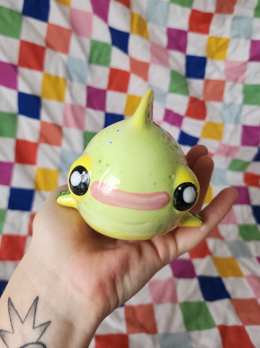 Swampy here is part of my "fibsh" ceramic collections, which are all one of a kind, released one at a time. He's made with a lowfire ceramic slipcast, and painstakingly hand glazed as well as glazed with underglaze pencils.